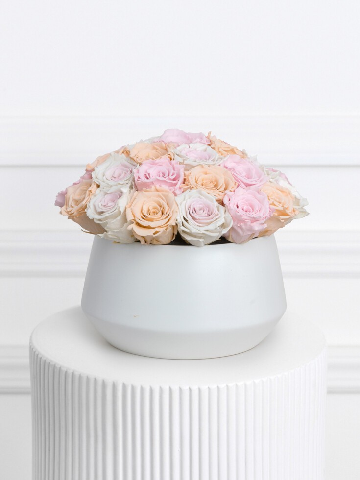 Our Classic Preserved Rose Composition includes 20 beautifully preserved roses hand-crafted in a decorative white ceramic bowl style vase. The overall design has a modern yet classic appearance and is a versatile design you're sure to love. Our preserved rose compositions make for a memorable gift for you or someone special! *Lasts up to a full year*