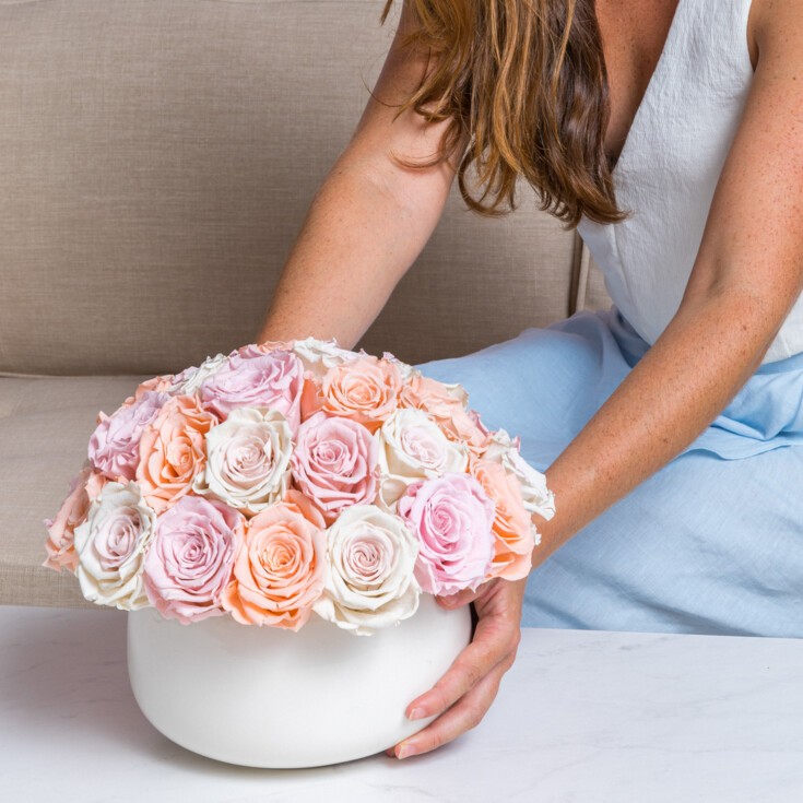 This bouquet is hand-delivered in our signature preserved bouquet gift box. The arrangement is topped with tissue paper and your gift note is tucked to the side of the arrangement.