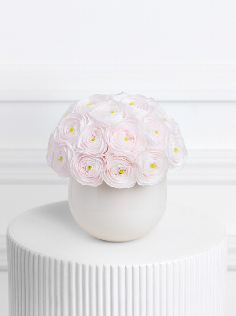 Our preserved ranunculus composition includes the most gorgeous preserved ranunculus, hand-crafted in a decorative white ceramic vase. Our preserved ranunculus were once fresh ranunculus that have been treated one by one to last an entire year! The overall design has a modern yet classic appearance and is a versatile design you're sure to adore! Our preserved ranunculus compositions make for a such memorable gift for you or someone special! *Lasts up to a full year*